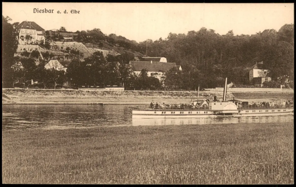 Ansichtskarte Diesbar (Elbe)-Nünchritz (Elbe) Stadtpartie und Elbdampfer 1915