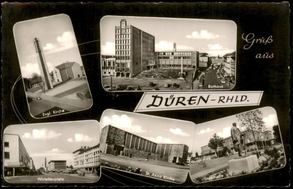 Ansichtskarte Düren MB: Ev. Kirche Rathaus Wirteltorplatz 1960