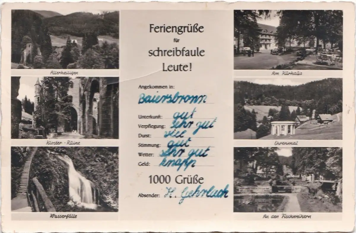 [Ansichtskarte] Feriengrüsse für schreibfaule Leute ! ALLERHEILIGEN, nördl. Hochschwarzwald, 620-900 m ü.M. - 1953.
