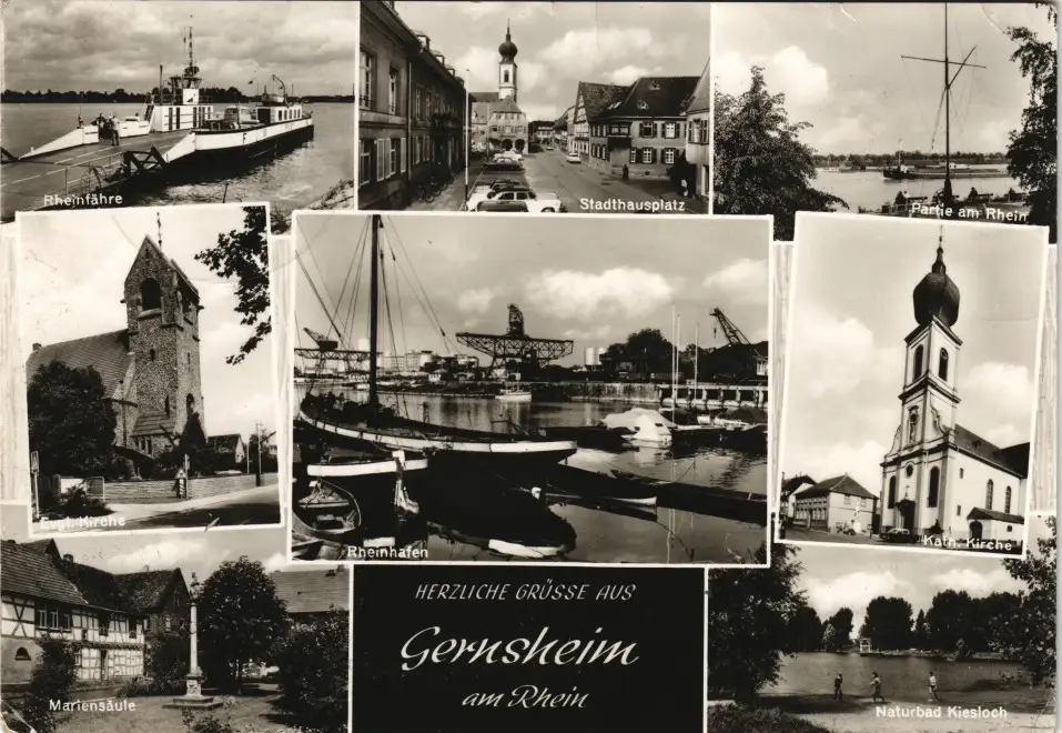 Ansichtskarte Gernsheim (Rhein) Schiff, Straßen, Markt, Rheinhafen uvm 1975