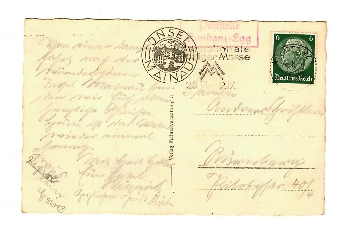 Ansichtskarte Insel Mainau 1937, Posteestelle Konstanz-Egg