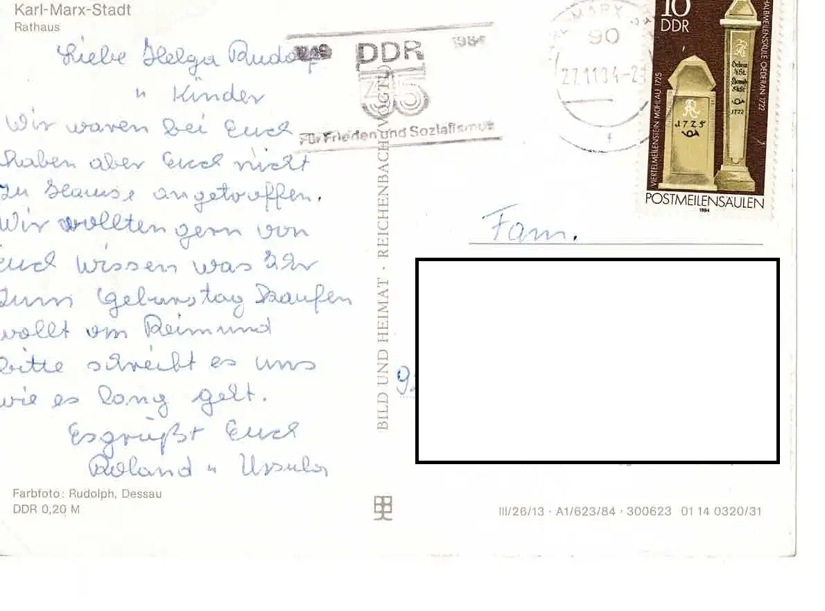 Ansichtskarte Karl Marx Stadt - Chemnitz - Rathaus - gelaufen 1984