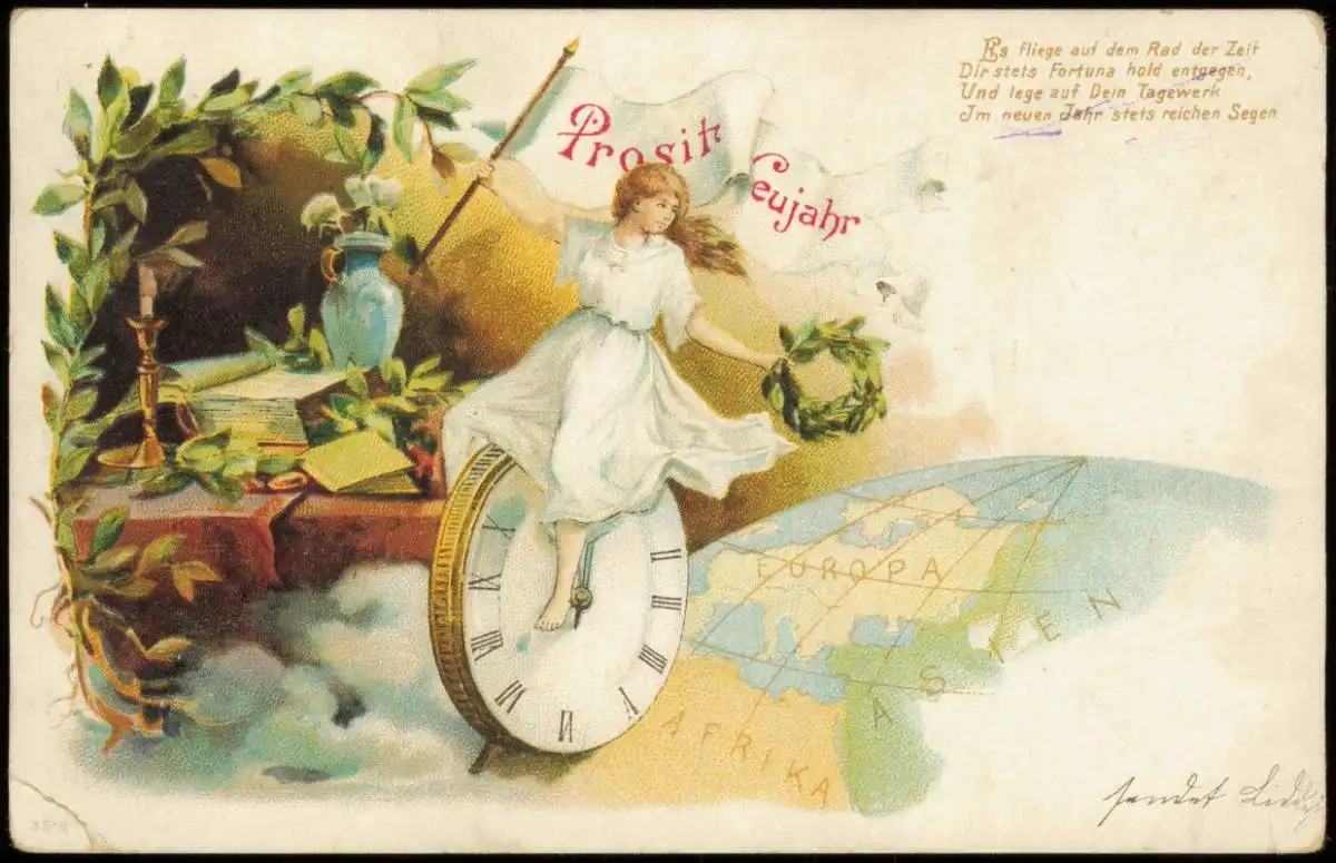 Ansichtskarte Neujahr Sylvester New Year Frau sitzend auf Uhr 1902