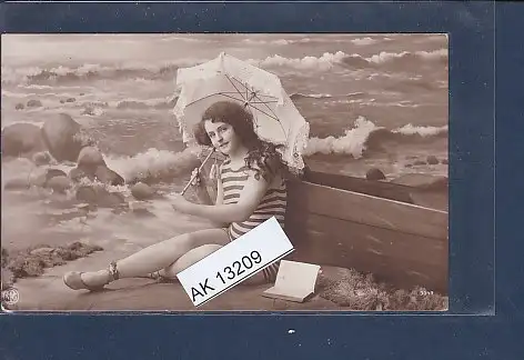 [Ansichtskarte] Photo AK Frau am Strand am Boot gelehnt in Bademode 1920.