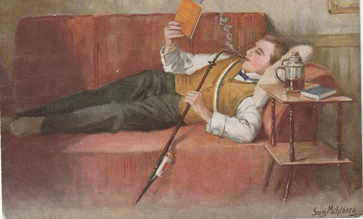[Ansichtskarte] STUDENTICA, "Studio auf der Bude" Lesender Student mit Tabakspfeife, Künstler-Karte Georg Mühlberg, Verlag König - Heidelberg.