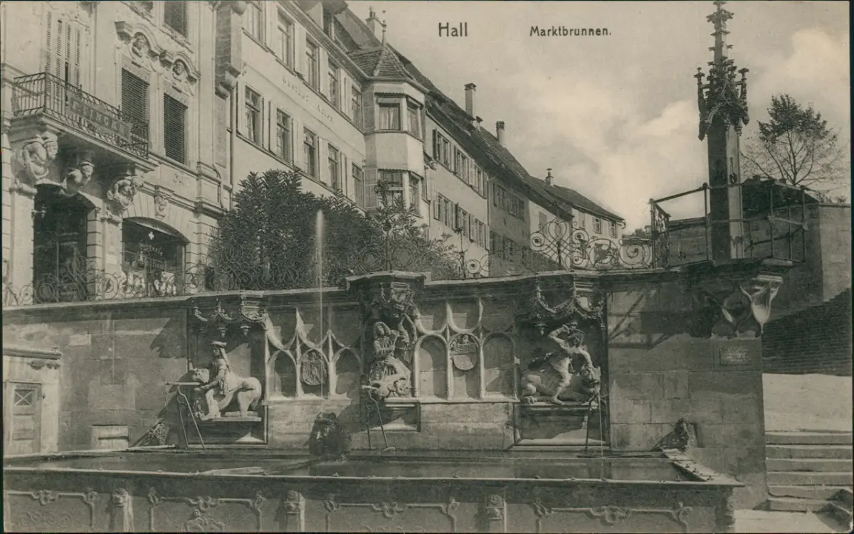 Ansichtskarte Schwäbisch Hall Marktbrunnen und Häuserzeile 1911