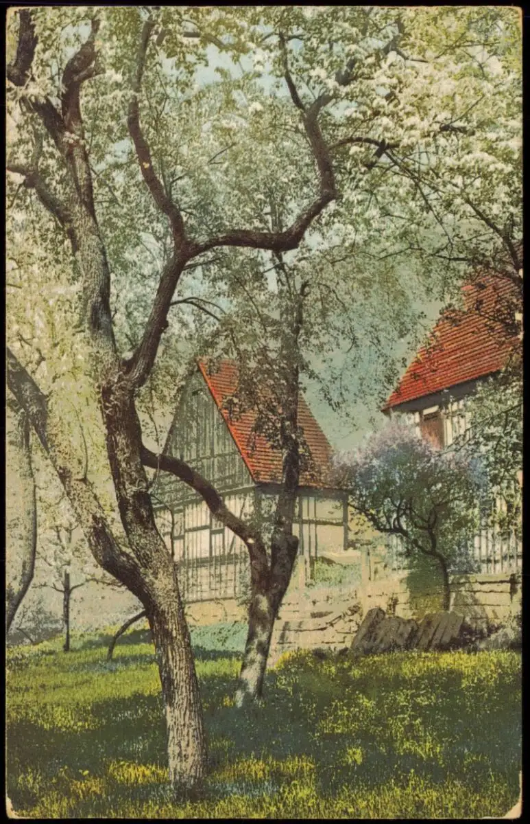 Ansichtskarte Stimmungsbild: Frühling Bäume in Blüte Fachwerkhäuser 1909