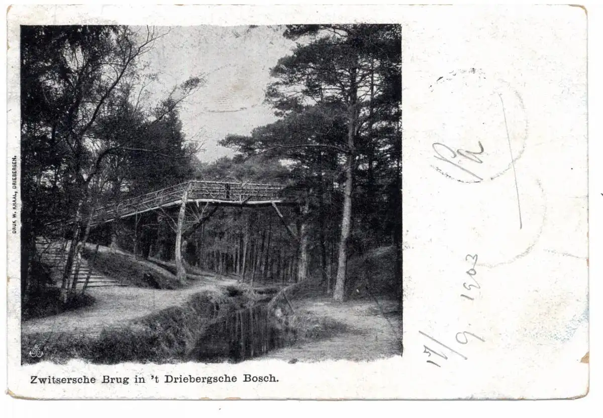 [Ansichtskarte] UTRECHT - DRIEBERGEN, Zwitsersche Brug in 't Driebergsche Bosch, Bahnpost / TPO / Ambulant Rotterdam - Emmerich, 1903.