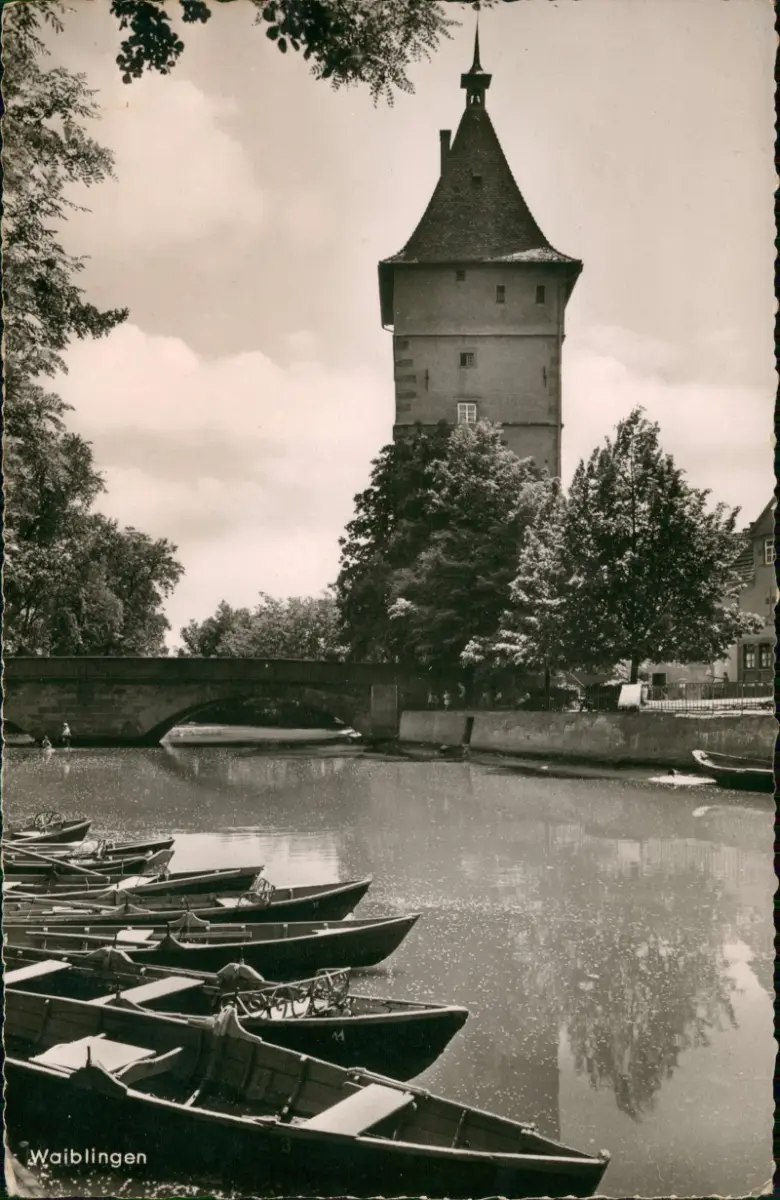 Ansichtskarte Waiblingen Turm Flußpartie Bootsanleger 1968