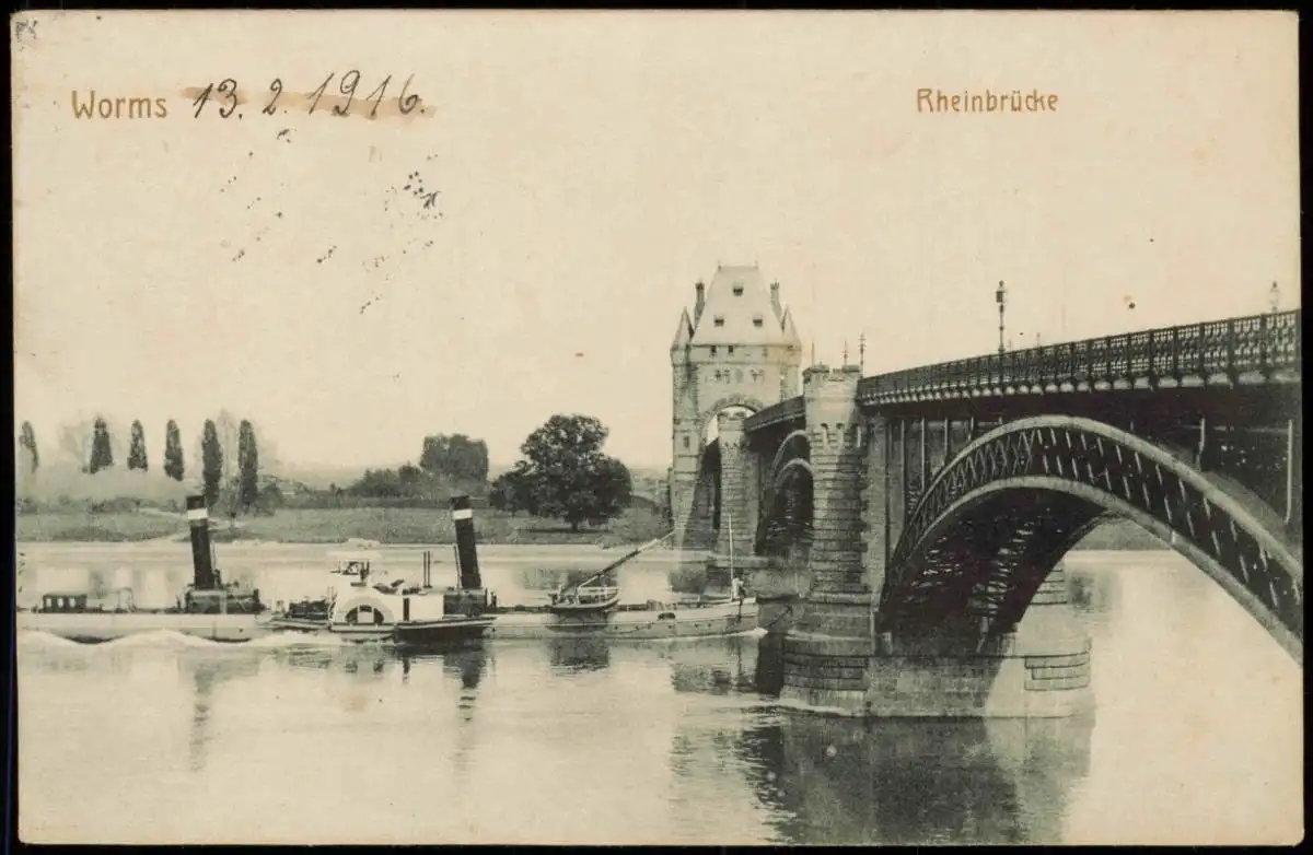 Ansichtskarte Worms Rheinbrücke Rheindampfer Schaufelraddampfer 1916