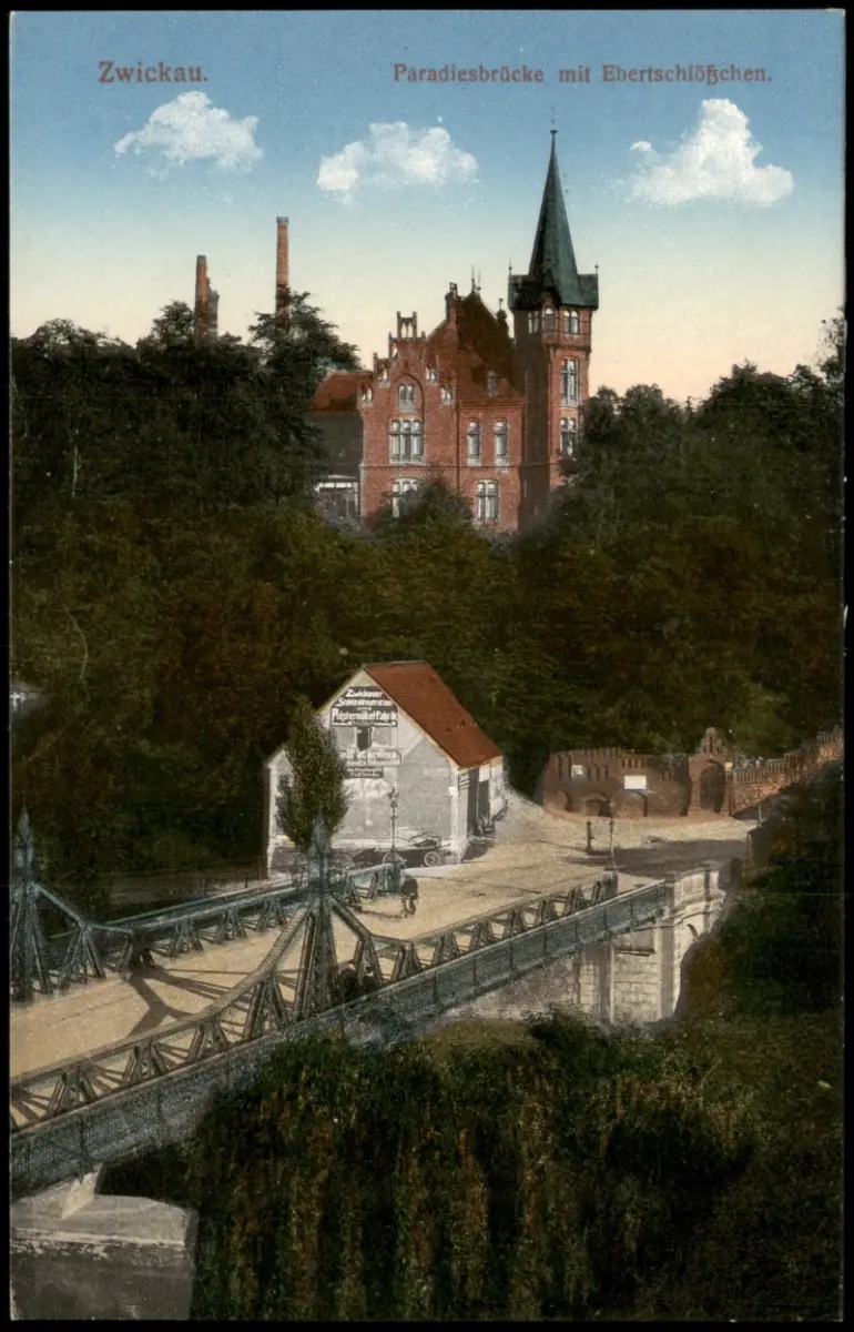Ansichtskarte Zwickau Paradiesbrücke mit Ebertschlößchen. 1916