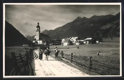 AK Neustift im Stubai, Ortsansicht von der Landstrasse, mit Wanderern