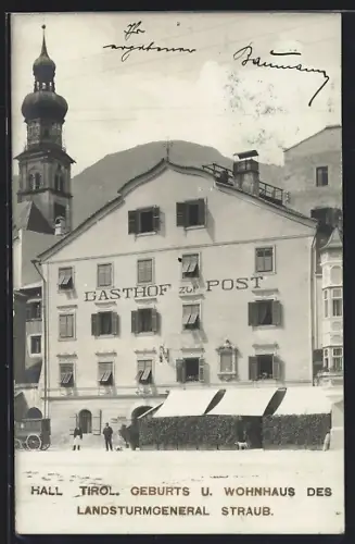 AK Hall in Tirol, Gasthof zur Post / Geburts- u. Wohnhaus des Landsturmgeneral Straub, Kirchturm
