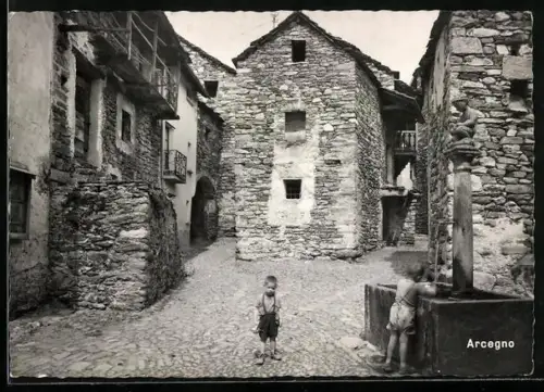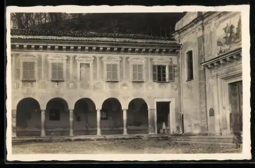 AK Carona, Innenhof mit Arkadengang und Tor mit Reiter-Fresko