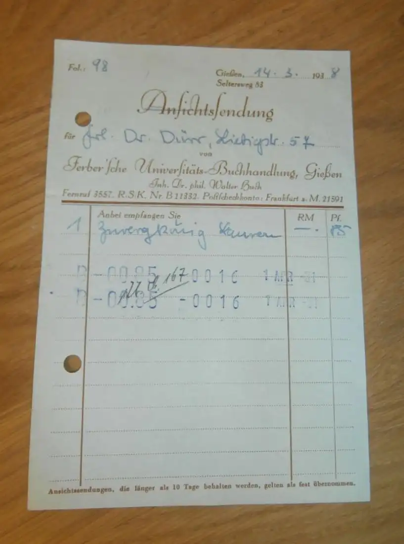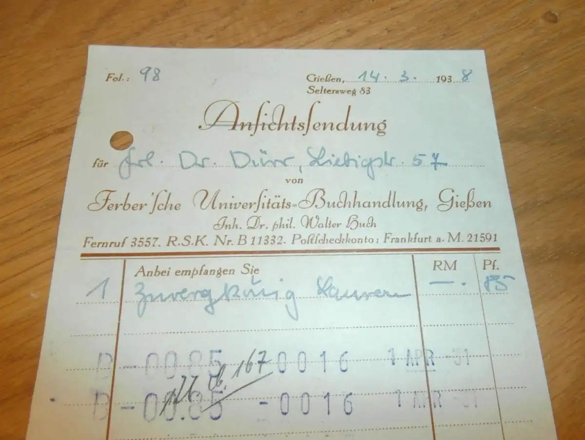 Ansichtssendung - Ferber `sche Buchhandlung in Gießen , 1938 , altes Dokument / Rechnung , Reklame / Werbung , GiessenAZ9-W