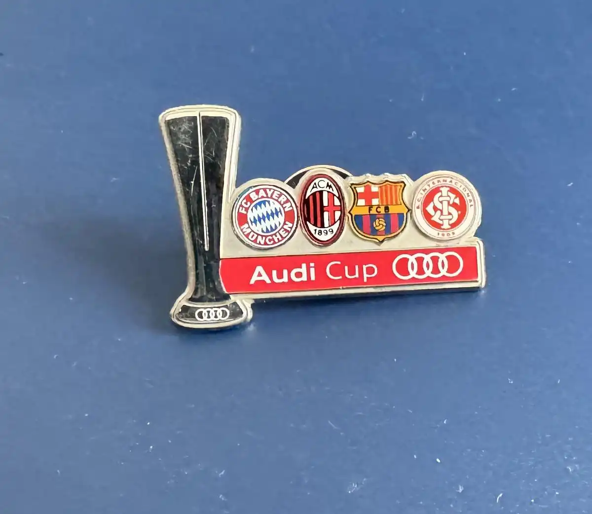 Ansteck PIN vom Audi Cup 2011, ausgetragen in der Allianz Arena, teilnehmende Mannschaften waren FC Bayern, AC Mailand, FC Barcelona und SC Porto Alegre.