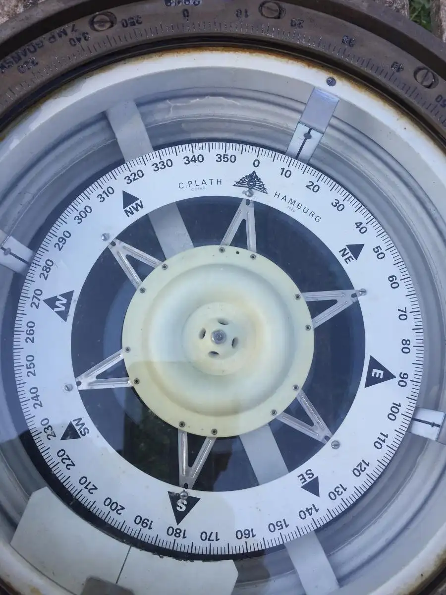 Entdecken Sie ein Stück maritime Geschichte mit diesem beeindruckenden alten Trocken-Magnetkompass der renommierten Firma C. Plath-Hamburg. Gegründet im Jahr 1837, stellt dieses Unternehmen seit über einem Jahrhundert Magnetkompasse für die Handelsschifffahrt weltweit her.