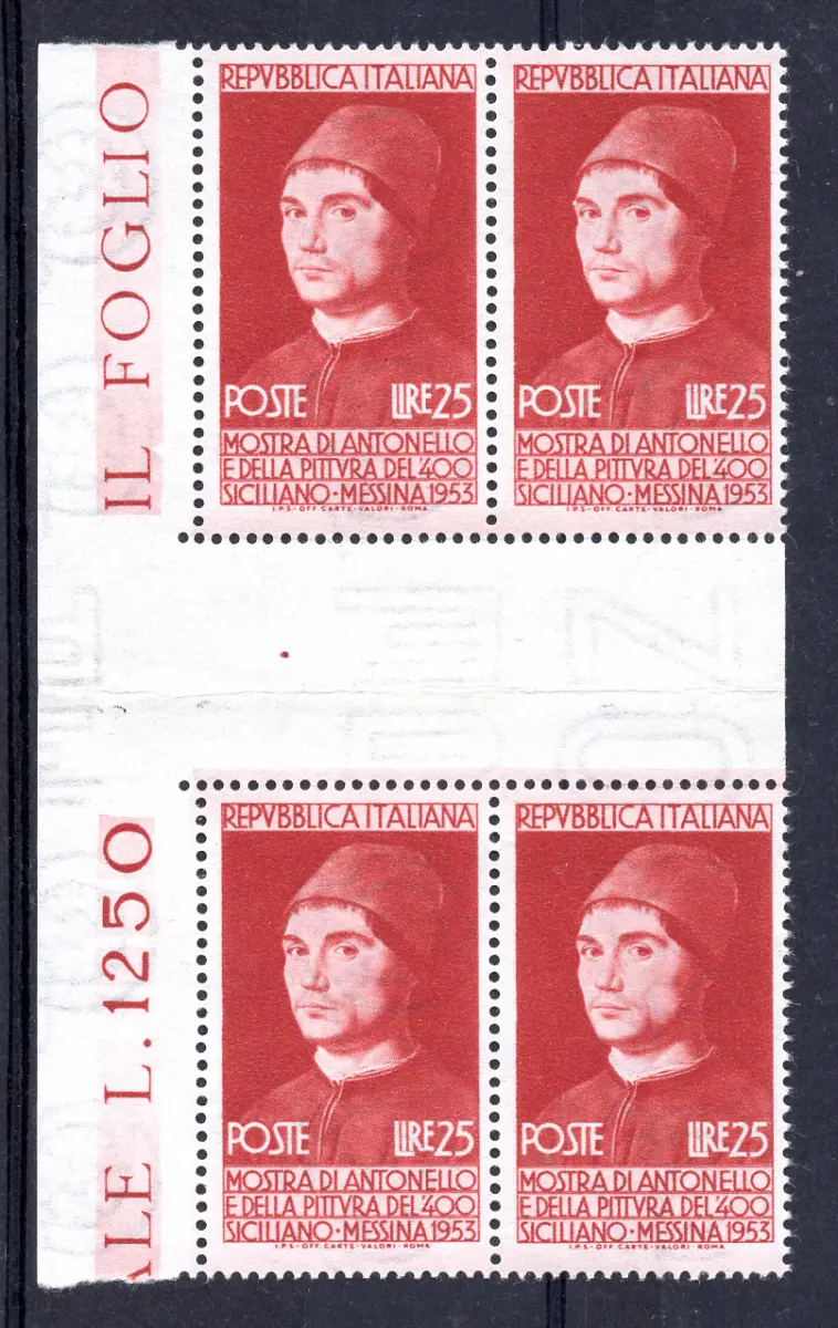 Antonello da Messina Viererblock mit Vollgummi-Zwischenraum - MHN - - Antonello da Messina Nr. 706 im Viererblock, der in der Mitte durch Gruppenzwischenraum getrennt ist - Ungewöhnlich - Kat. euro 50 Cod. 350/14