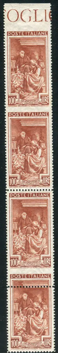 Arbeit Lire 100 Streifen Sorten zu sehen Vollgummi - Arbeit Lire 100 Nr. 651 wunderschöner vertikaler Streifen von vier Exemplaren; die ersten beiden Exemplare vertikales Paar nicht horizontal und oben gezähnt (Nr. 652m), die beiden unteren vertikalen Drehmoment mit stark nach unten verschobener Mittelverzahnung (Nr. 652ma) - Selten - Kat. euro 4.100+ Cod. 536/13