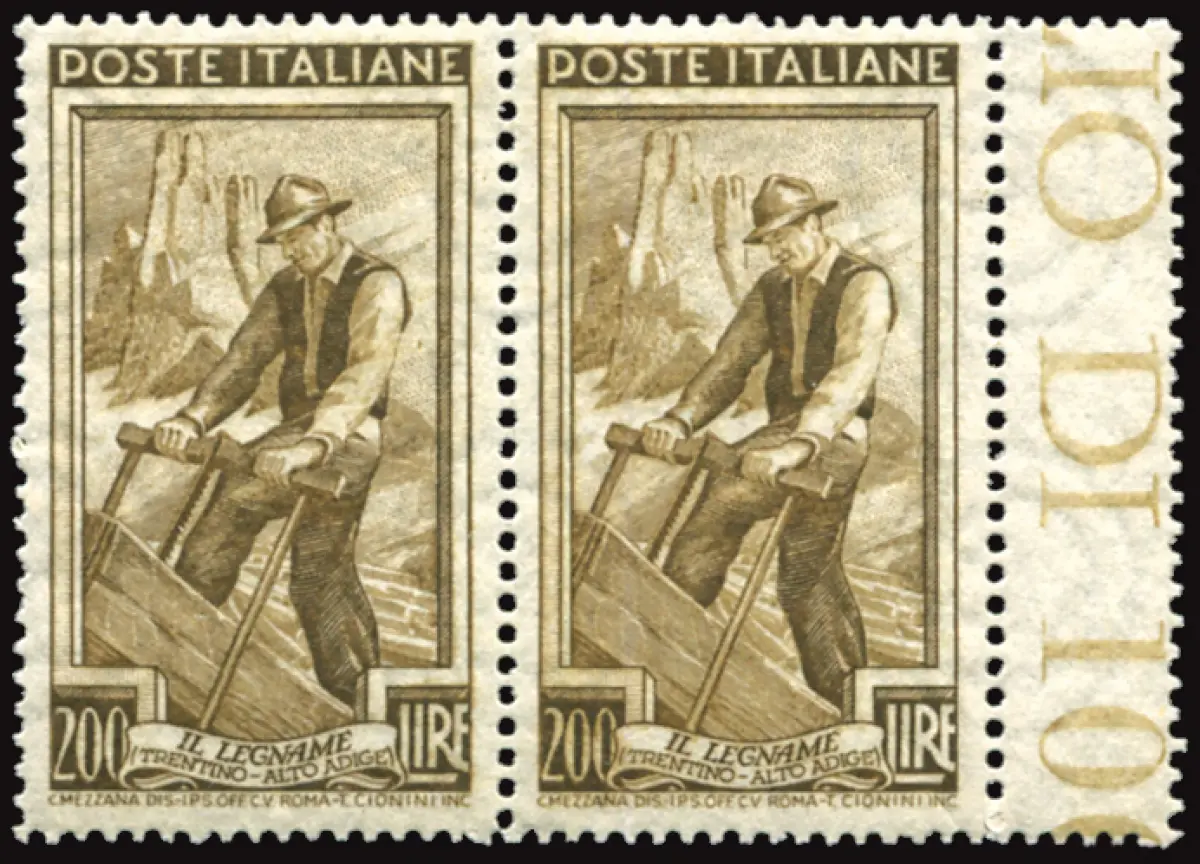 MNH Vollgummi - Arbeit Lire 200 Nr. 652 horizontales Paar, das rechte Exemplar mit doppelter vertikaler Verzahnung rechts am Blattrand - Ungewöhnlich - Kat. euro 315 Cod. 471/16
