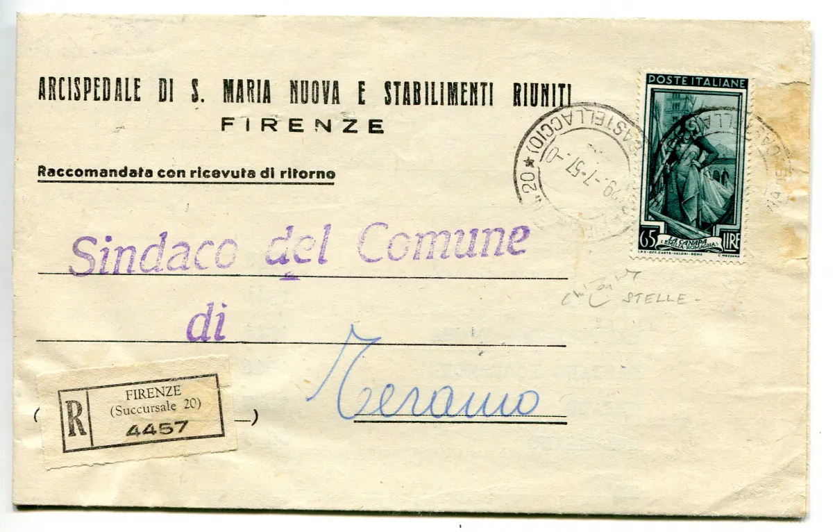 Umschlag - Arbeit Lire 65 filigran Sterne Nr. 760 isoliert auf Falz Racc. mit Rückschein von Florenz nach Teramo am 29.7.57 - Ungewöhnlich - Zert. Ray. Cod. 309/13