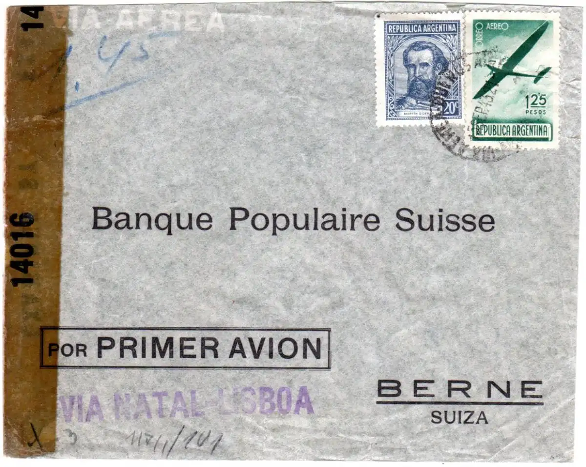 Argentinien 1943, WW II Luftpost Zensur Brief id. Schweiz m. L1 Via Natal-Lisboa