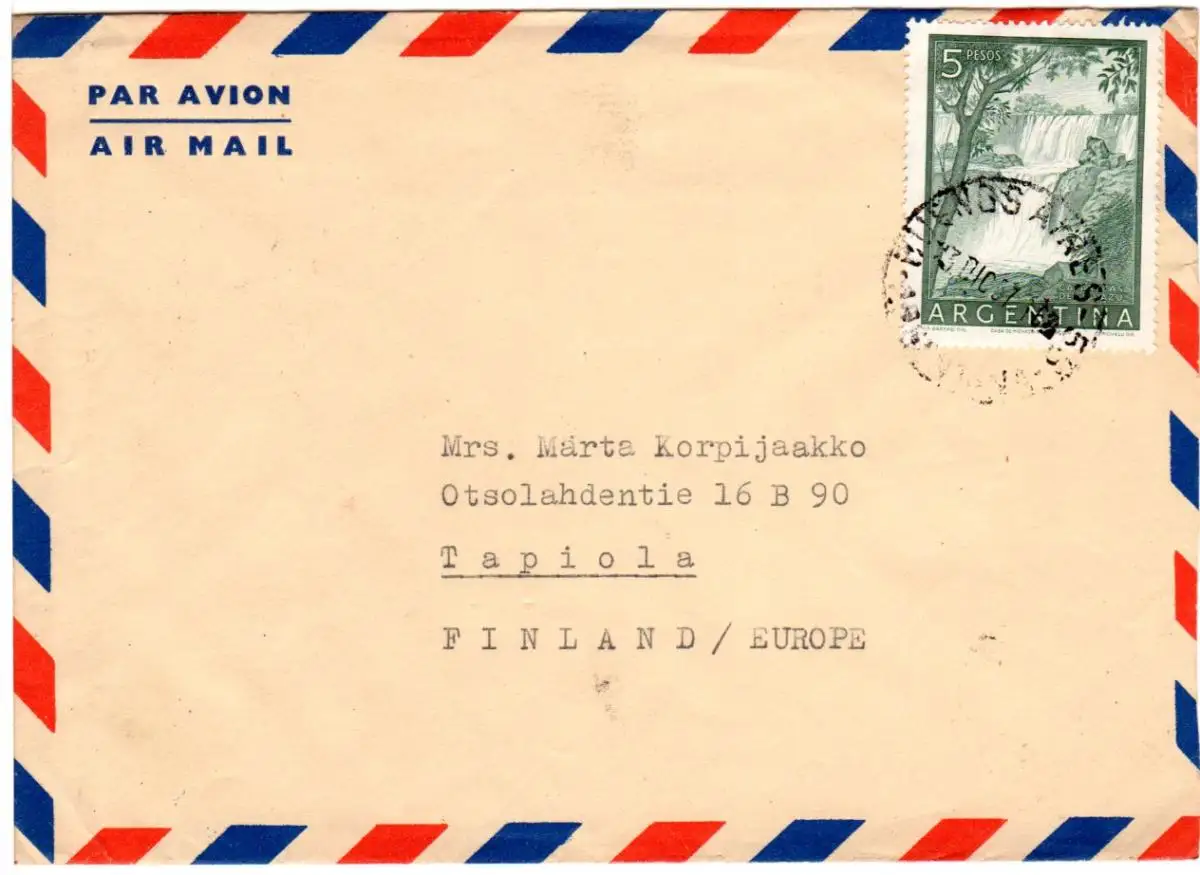 Argentinien 1957, EF 5 P. Iguazu Wasserfall auf Luftpost Brief n. Finnland