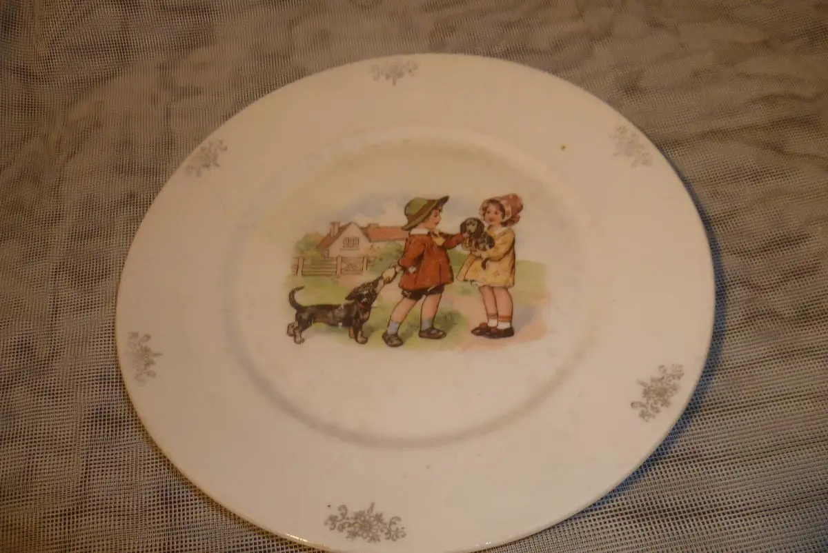 Art Deko Kinder Platzteller mit lieblichem Dekor: 2 Mädchen mit ihren Dackeln beim spielen Durchmesser: 19,5 cm