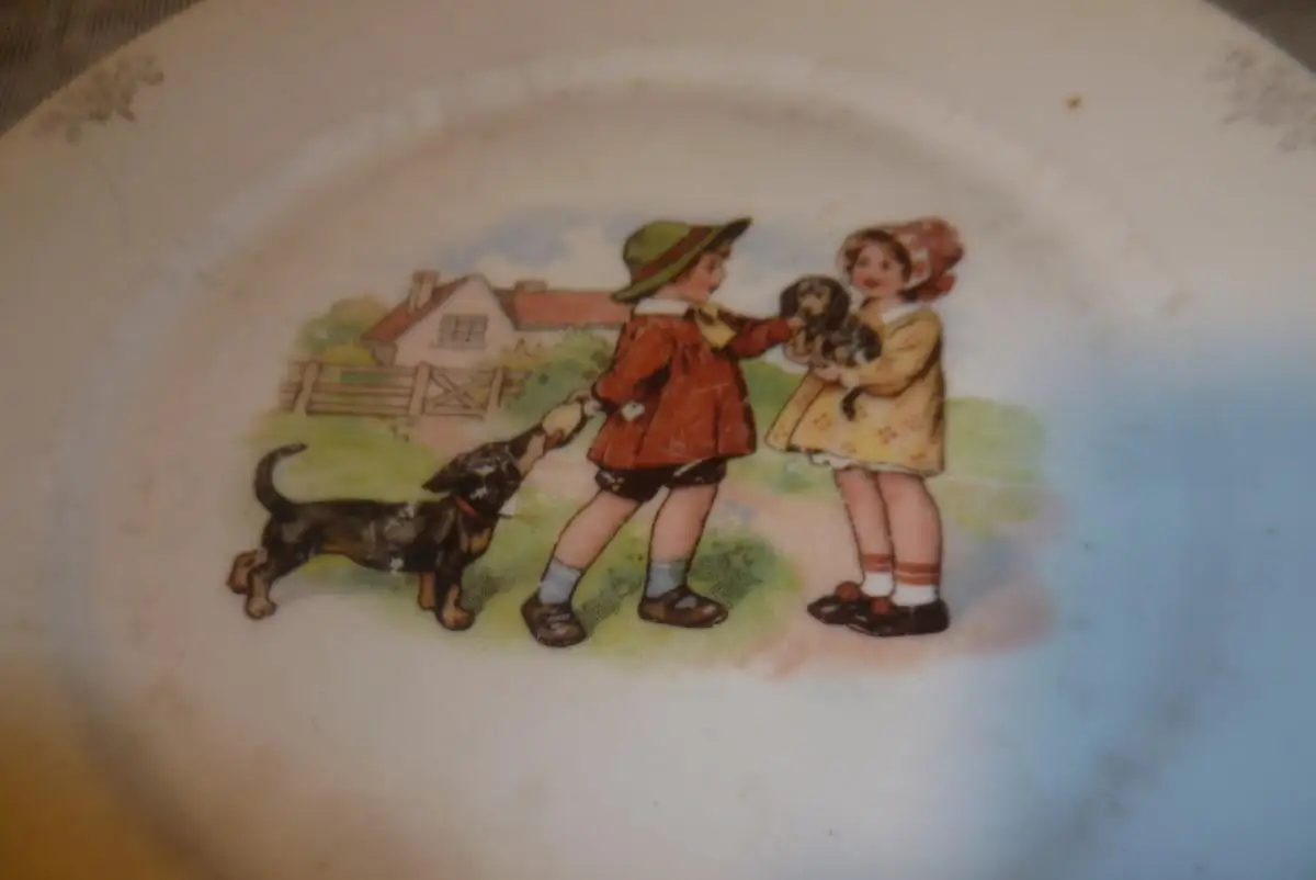 Art Deko Kinder Platzteller mit lieblichem Dekor: 2 Mädchen mit ihren Dackeln beim spielen