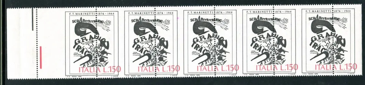Arte '76 Marinetti Fünf-Sorten-Streifen Vollgummi - Arte '76 Marinetti wunderschöner Fünfer-Streifen mit vertikaler Verzahnung und rotem Druck Italien L. 150 stark nach rechts verschoben - Seltener Code 651/8