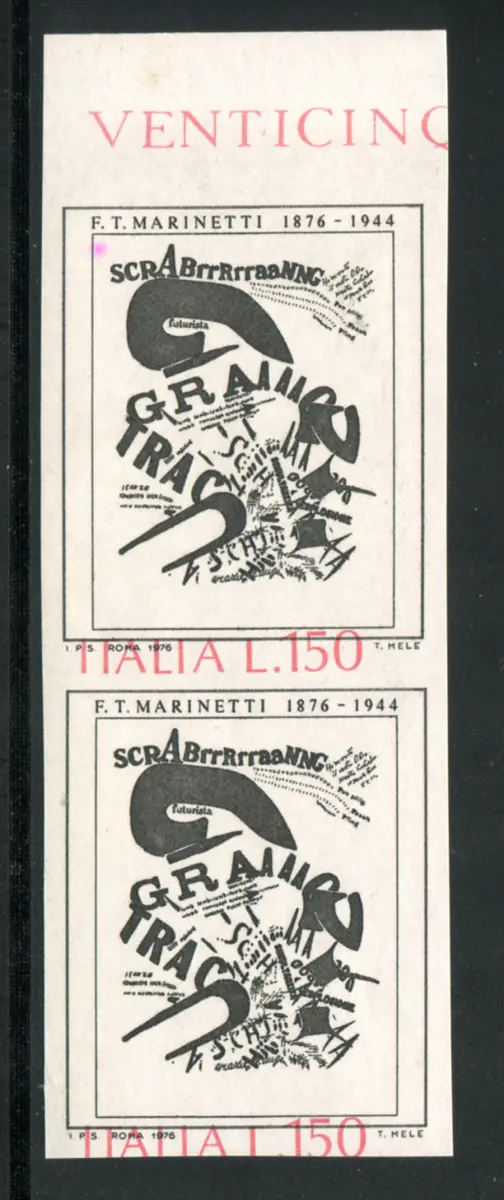 Arte '76 Marinetti ungezahnte und rot verschobene Sorte Vollgummi - Arte '76 Marinetti Nr. 1338 ungezähntes vertikales Paar mit stark nach unten verschobenem Rotdruck - nicht katalogisiert Code 652/8
