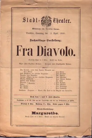 Auber, D.F.E: Programmzettel zu: Fra Diavolo. Komische Oper in drei Akten. Regie: Herr Kirchner. Dirigent: Herr Prüwer. Aufführung: Stadt - Theater am 15. April 1900. Direction: Theodor Loewe. (Aus der Breslauer Theater - Zeitung).