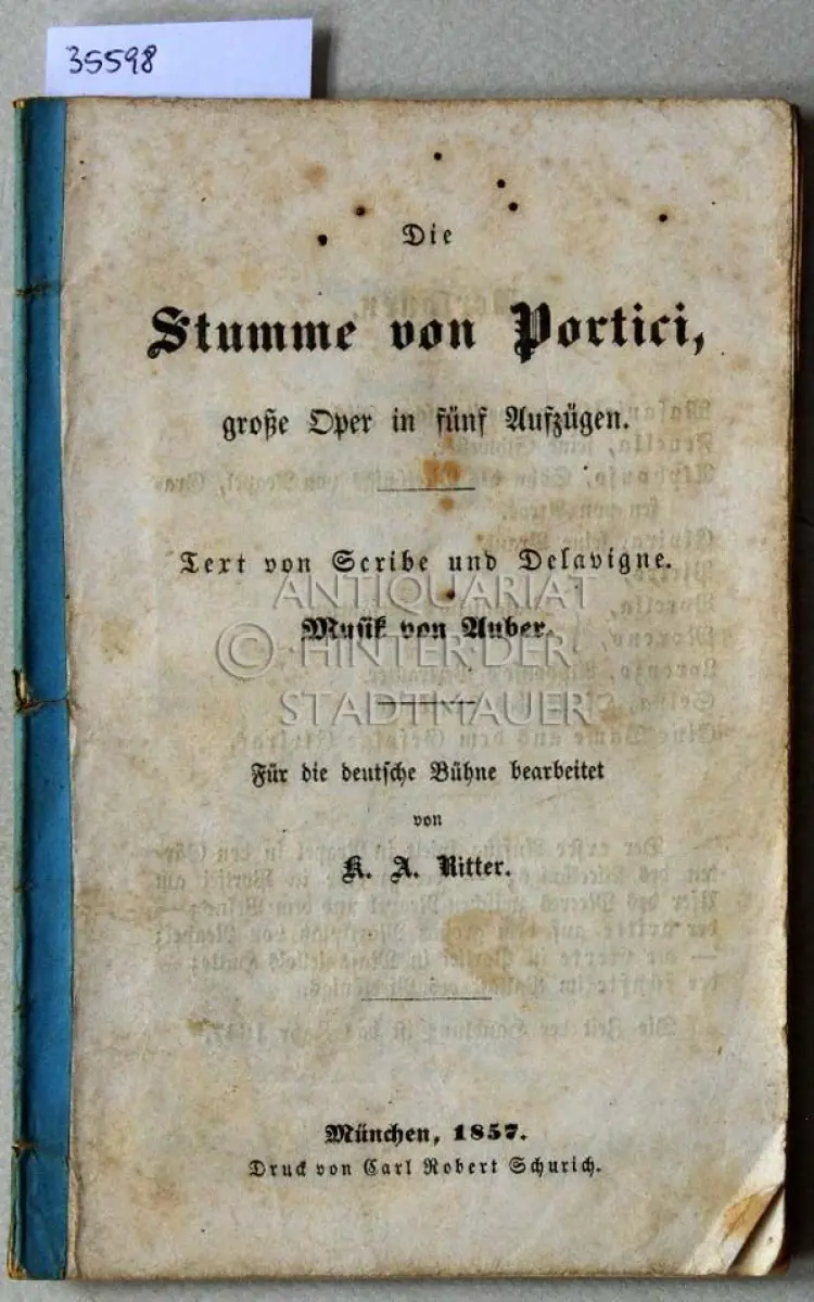 Titel: Die Stumme von Portici: große Oper in fünf Aufzügen. (Libretto) Text von Scribe und Delavigne, Musik von Auber. Für die deutsche Bühne bearb. v. K. A. Ritter