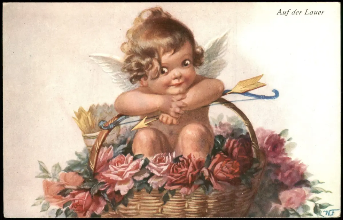 Name: Auf der Lauer Künstlerkarte Mädchen mit Amor-Bogen u. Pfeilen
