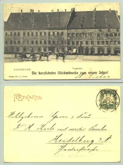 Artikelbeschreibung u. Zustand : Siehe Scan / Eckknick. Weitere Infos : Ansichtskarte. Augsburg - Fuggerhaus" mit aufgedrucktem Text : 'Die herzlichsten Glueckwuensche zum neuen Jahr !'. PLZ-Bereich pauschal 86150. Postalisch gelaufen 1902