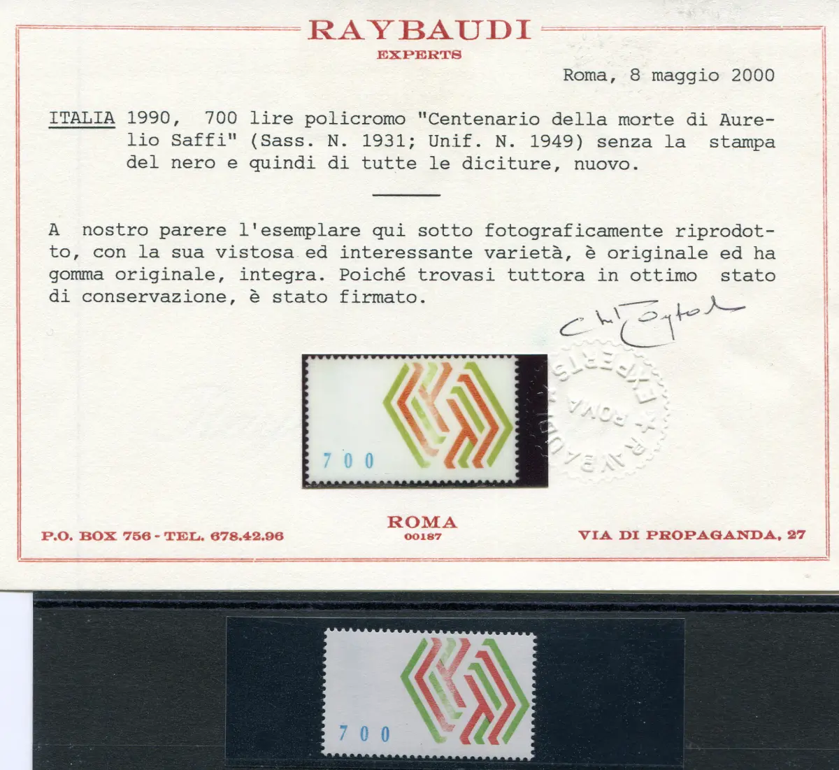 Aurelio Saffi Sorte ohne Schwarzdruck Vollgummi - MHN - - Aurelio Saffi Nr. 1931 ohne Schwarzdruck und somit ohne alle Beschriftungen (Sass. spec. Nr. 1563 Ab) - auffällig und ungewöhnlich - Zert. Ray. - Kat. euro 3.000 Cod. 764/14