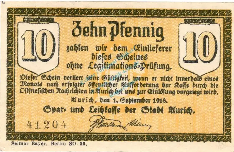 Aurich , Notgeld 10 Pfennig -Antiqua- unc-kfr. Ti.0270.10.16 , Niedersachsen 1918 Verkehrsausgabe
