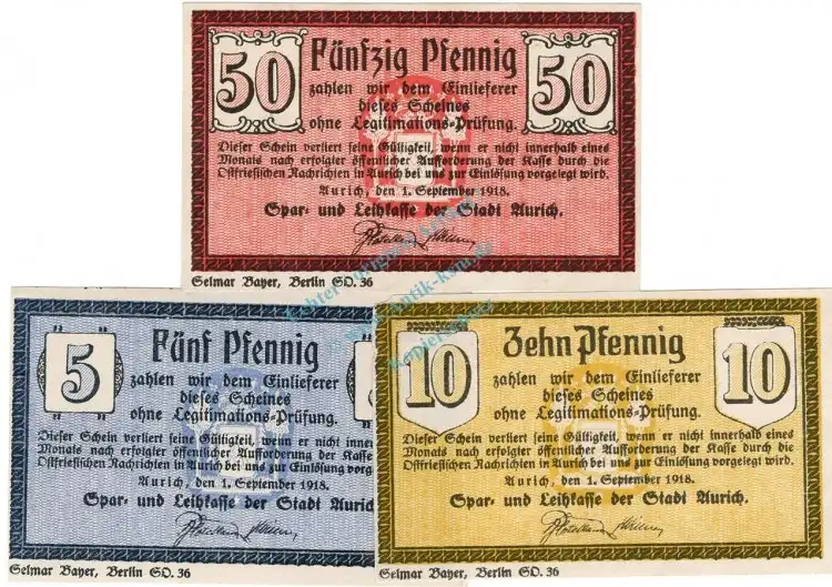 Aurich , Notgeld Set mit 3 Scheinen unc-kfr. Ti.0270.10.10-12 , Niedersachsen 1918 Verkehrsausgabe
