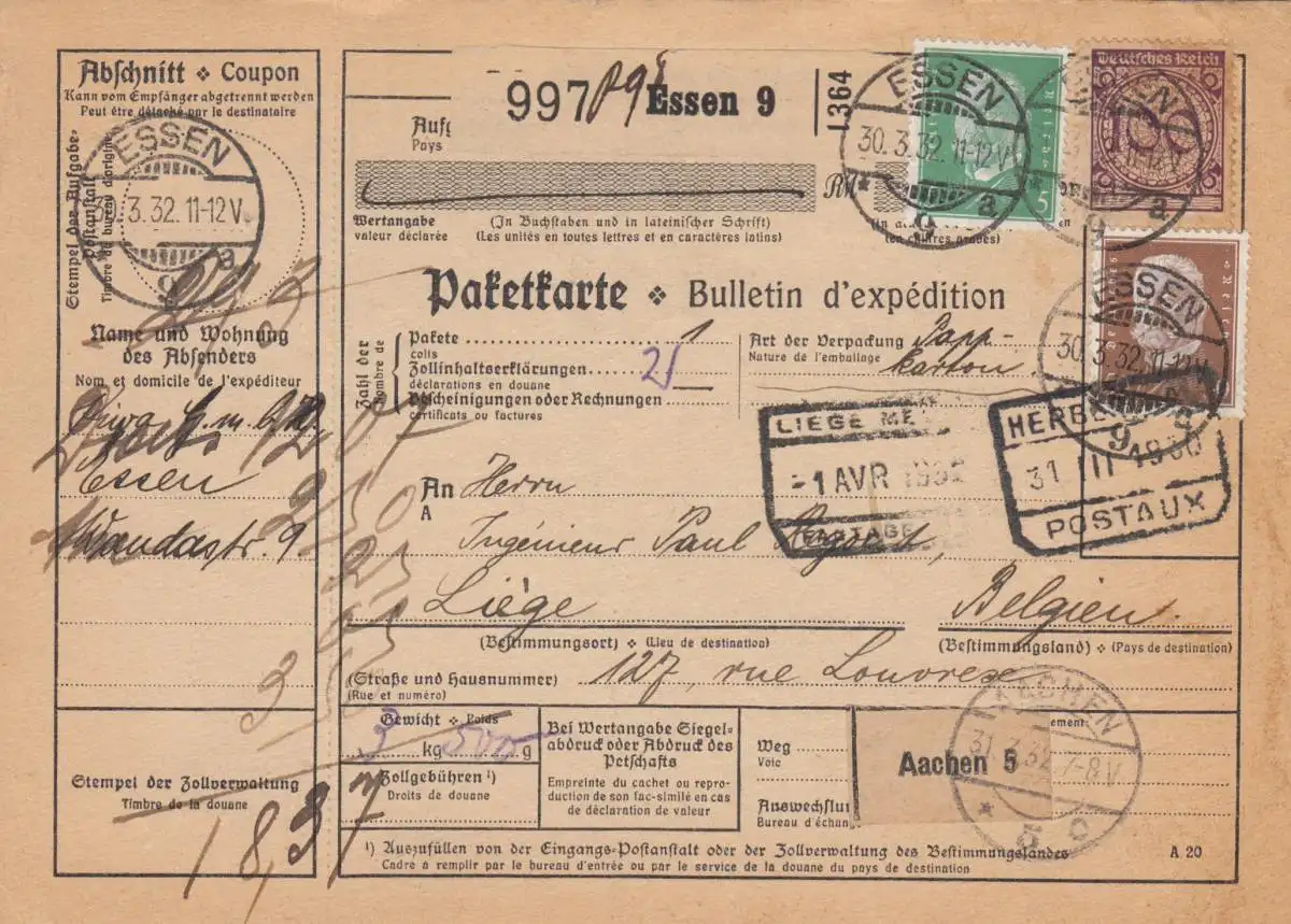 Auslandspaketkarte 1932 Essen nach Liège / Belgien