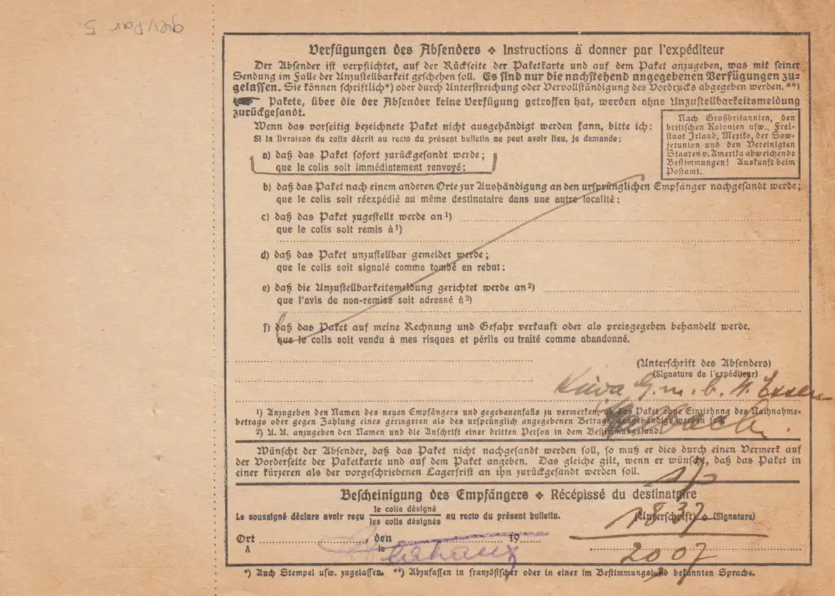 Teilweise wurden vom Scanner ca. 2mm vom Bildrand abgeschnitten. Der Beleg und Briefmarke (n) sind vollständig erhalten.