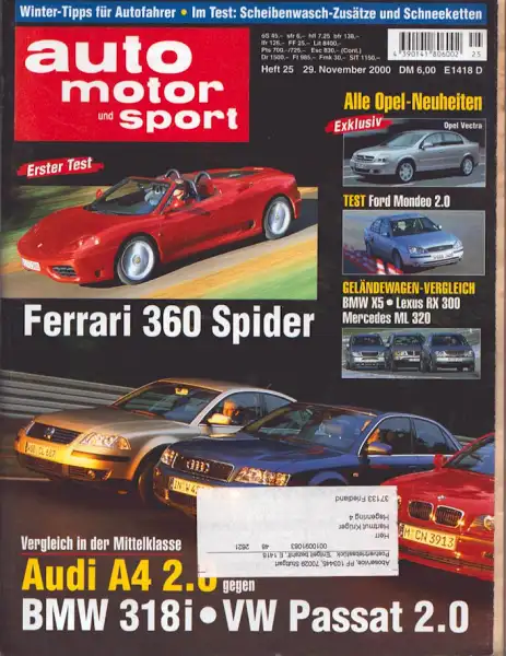 Ferrari 360 Spider Audi A 4 2.0 / BMW 318i / VW Passat 2.0 Honda Civic Opel Corsa 1.7 DTI 16 V / Renault Clio 1.9 dTI Morgan Aero 8 Ford Mondeo 2.0 Honda Accord 1.8 LS Fiat Doblo BMW X 5 3.0i / Lexus RX 300 / Mercedes-Benz ML 320 Mit Gebrauchsspuren
