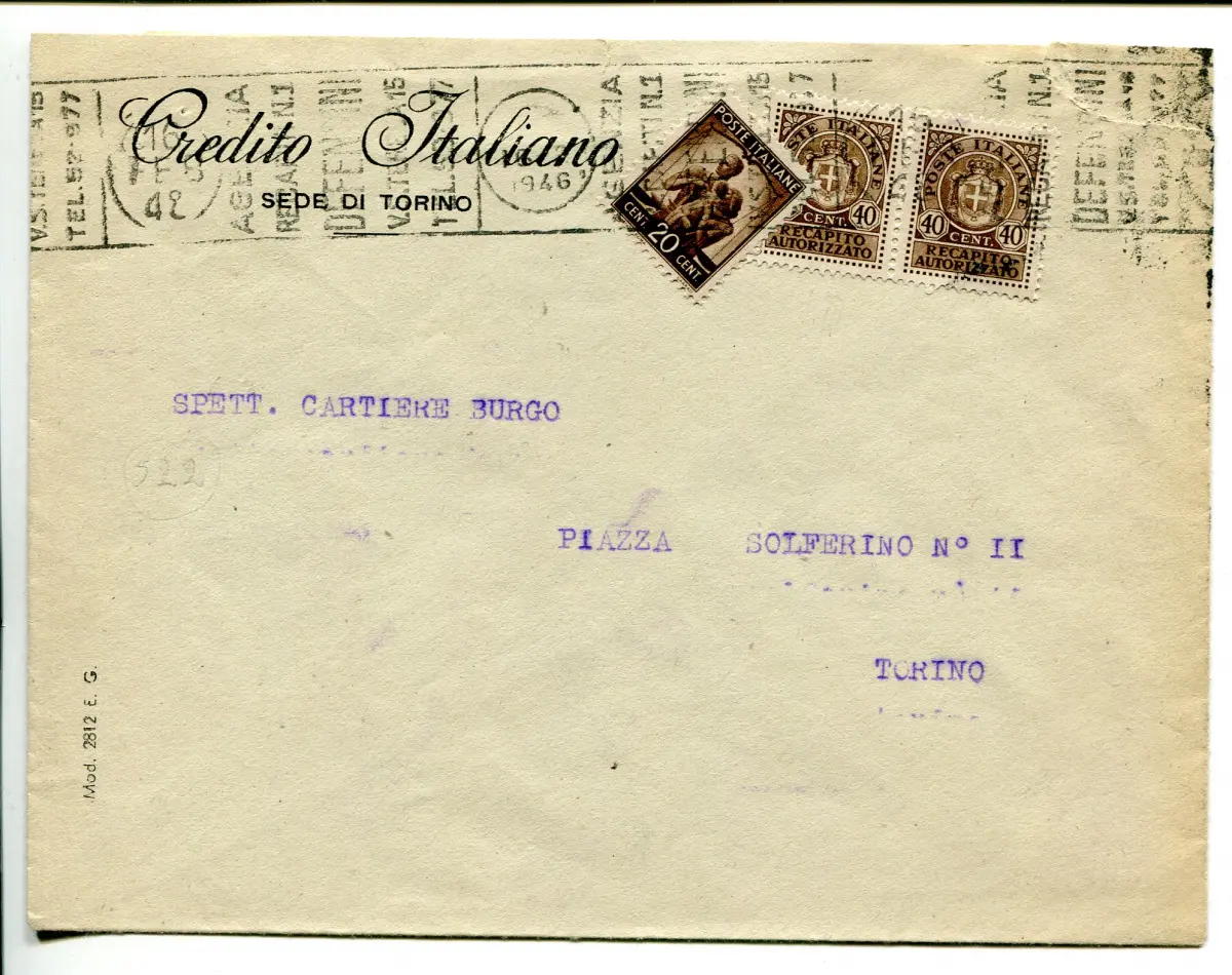 - Autorisierte Zustellung Cent. 40 Nr. 6 Paar + Zusatz Cent. 20 Demokratische auf Umschlag von Turin nach Stadt? am 16.2.46 mit Gleitringstempel am Datum der Zustellagentur Nr. 721/A