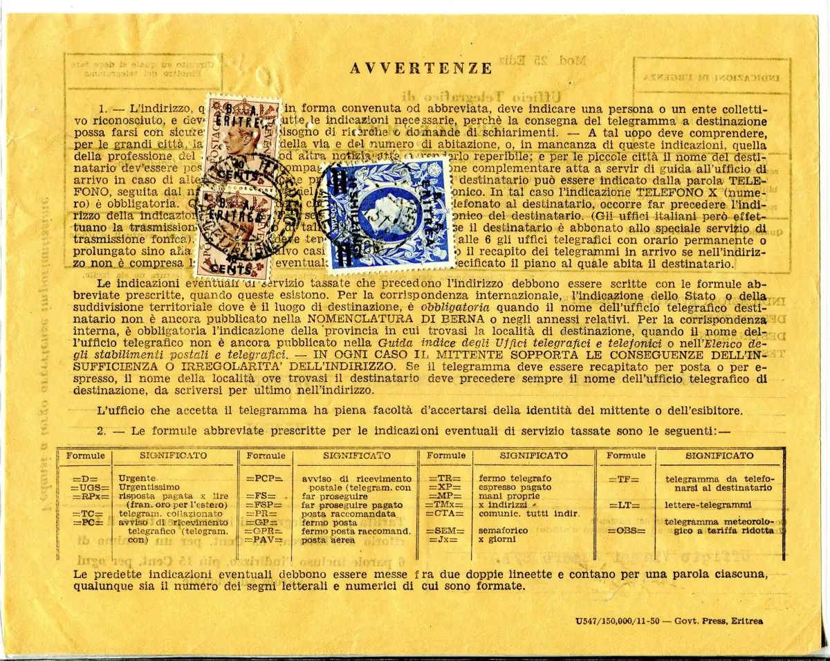 - B.A. Eritrea - 10 sh. Aufdruck B. A. Eritrea Nr. 26 + Zusatzpaar Nr. 19 auf Telegramm als Zahlungseingang Ann. Asmara 14.11.51 - sehr guter Erhaltungszustand - Selten - Kat. 1.000 n. 1057/L
