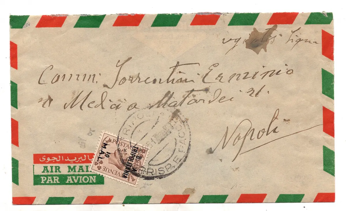 Umschlag - B. A. Tripolitanien - 10 mal auf 5 S. Nr. 20 isoliert auf Luftumschlag von Tripolis nach Neapel am 20.12.51 - Annullierung der Ankunft 23.12.51 - Kat. euro 100 Cod. 2803/WEB