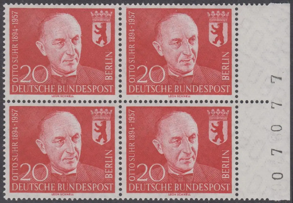 BERLIN 1958 Michel-Nummer 181 postfrisch BLOCK RÄNDER rechtsm/ Bogennummer - Prof. Otto Suhr, Politiker
