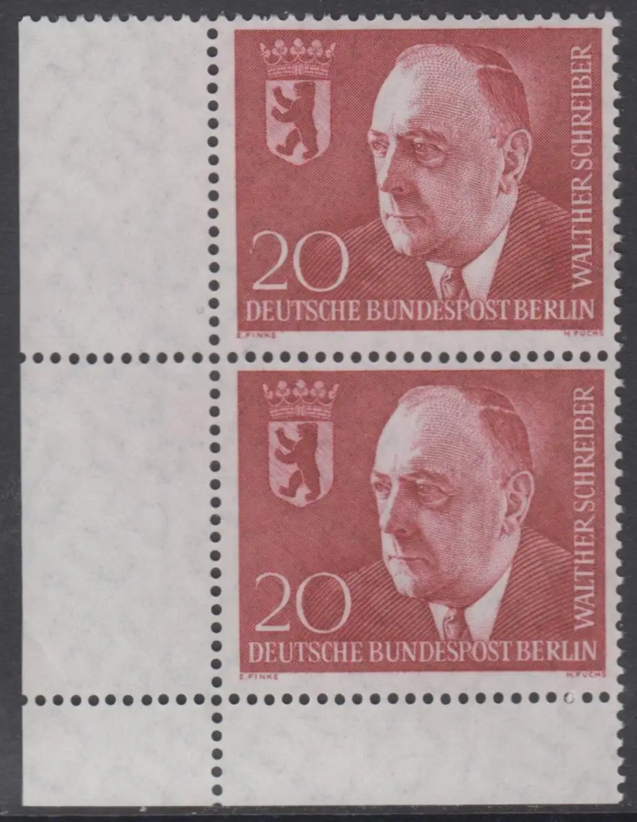 BERLIN 1960 Michel-Nummer 192 postfrisch vert.PAAR ECKRAND unten links - Todestag von Walther Schreiber, Politiker