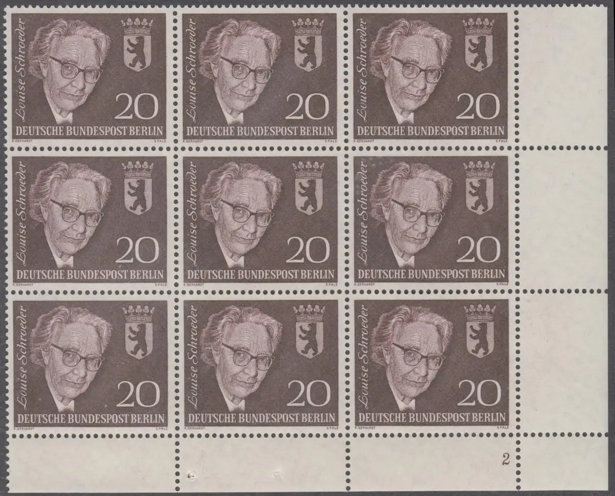 BERLIN 1961 Michel-Nummer 198 postfrisch BLOCK(9) ECKRAND unten rechts m/ Formnnummer - Todestag von Louise Schröder, Politikerin