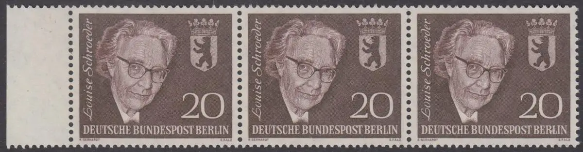 BERLIN 1961 Michel-Nummer 198 postfrisch horiz.STRIP(3) Rand links - Todestag von Louise Schröder, Politikerin