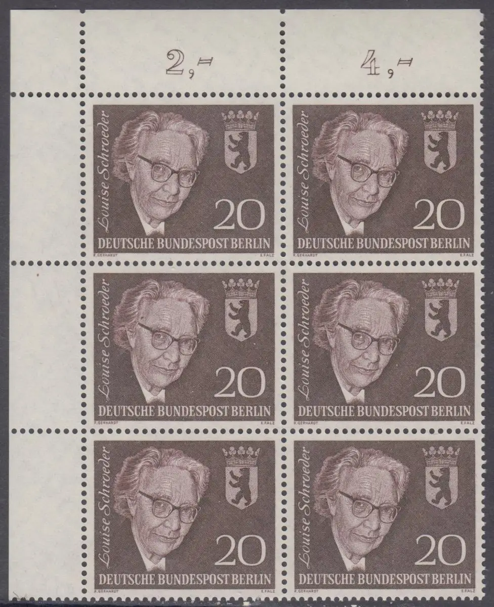BERLIN 1961 Michel-Nummer 198 postfrisch vert.BLOCK(6) ECKRAND oben links - Todestag von Louise Schröder, Politikerin