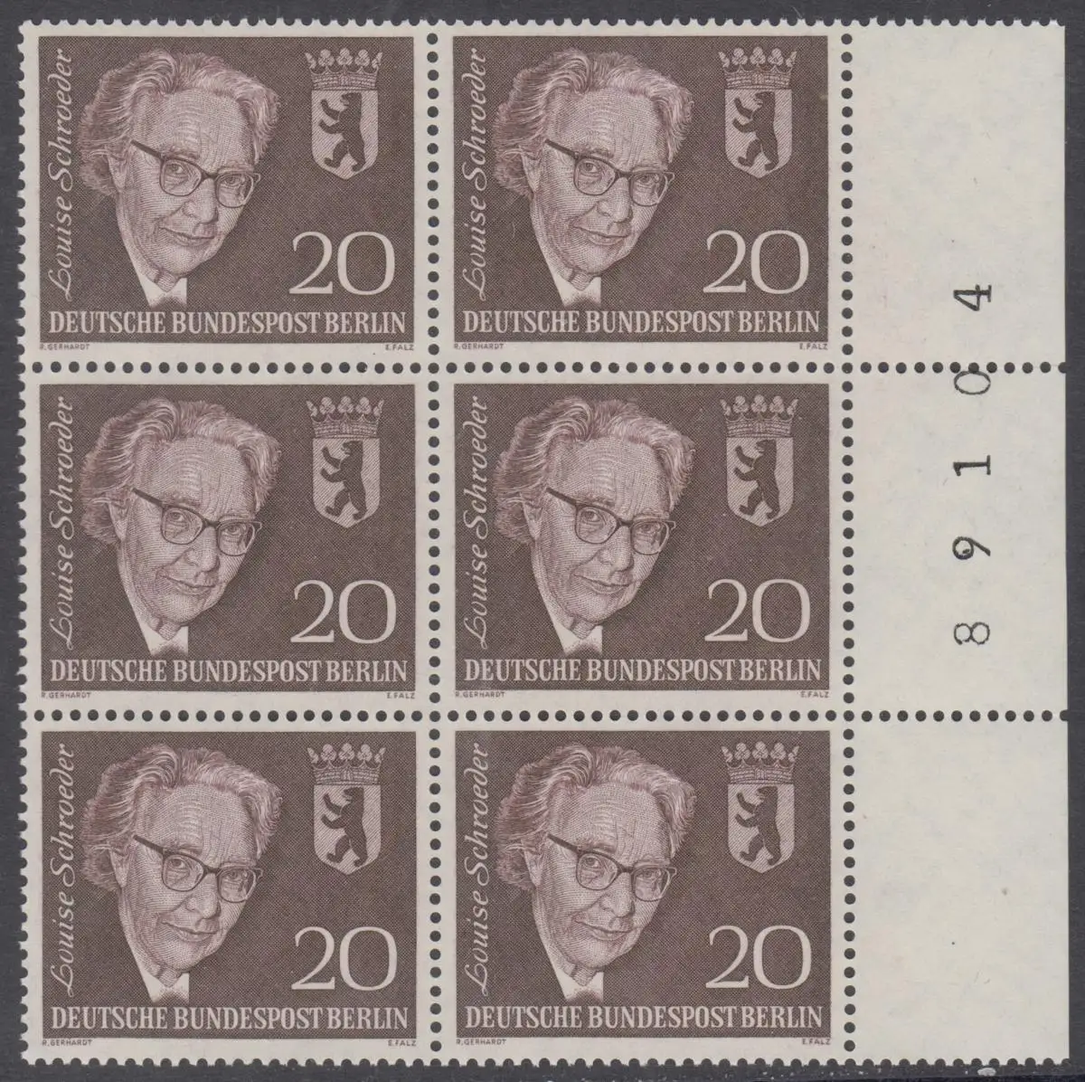 BERLIN 1961 Michel-Nummer 198 postfrisch vert.BLOCK(6) RÄNDER rechts m/ Bogenzähler (89104) - Todestag von Louise Schröder, Politikerin